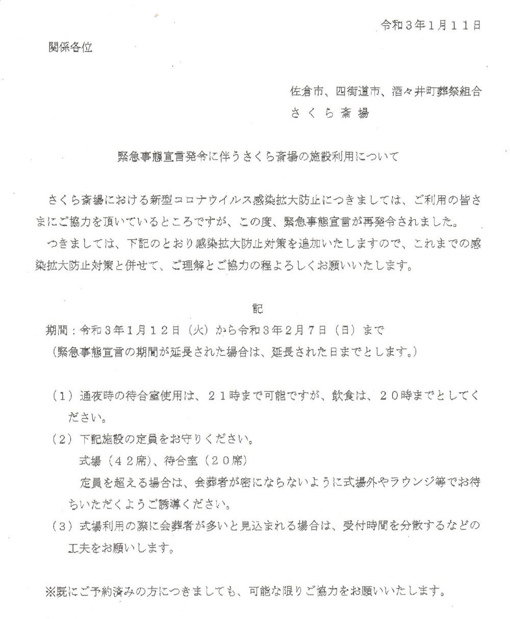 新型コロナウイルス感染拡大防止のため、各火葬斎場のご利用について協力要請が有りました。